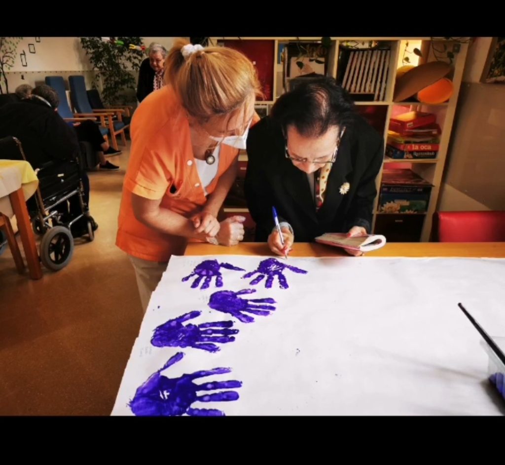 A les altres plantes es van fer murals amb les mans dels residents estampades i es va fer un llaç lila ben gran que hem penjat per la nostra casa i ha quedat preciós.